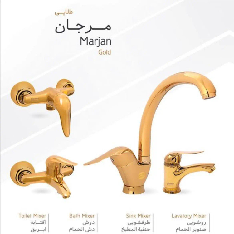 شیرآلات مدل مرجان برند طلاییه رنگ طلایی دست کامل شامل: ظرفشویی توالت حمام روشویی دارای ۵ سال گارانتی